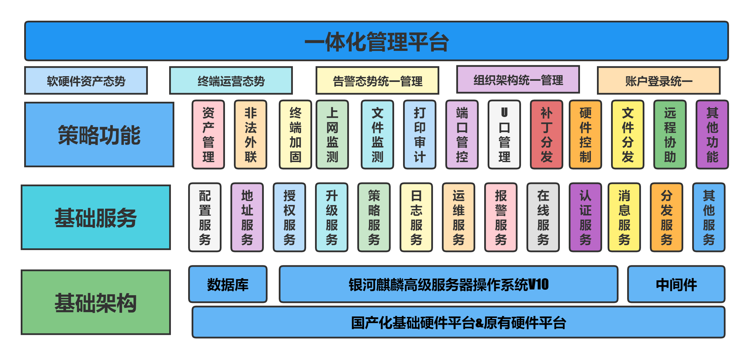 聯(lián)合方案以銀河麒麟高級服務器操作系統(tǒng)V10為支點,在深入理解網(wǎng)絡安全法和等保相關政策法規(guī)要求的基礎上,構建以終端管理為核心,形成集多種終端安全防護能力為一體的管理體系,為管理者提供終端多位一體、統(tǒng)一管理的終端及網(wǎng)絡安全聯(lián)合解決方案,為用戶創(chuàng)建一個安全、可靠、穩(wěn)定的辦公環(huán)境。核心功能包括: