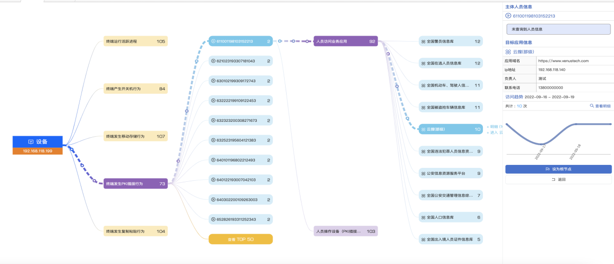 通過異常行為分析發(fā)現(xiàn)可疑設(shè)備(用戶)后,從可疑設(shè)備出發(fā),查看設(shè)備基本信息,探索此設(shè)備的具體行為,還原設(shè)備訪問應(yīng)用、下載敏感文件、打印敏感文件等行為信息。幫助用戶溯源及分析泄漏事件影響。
