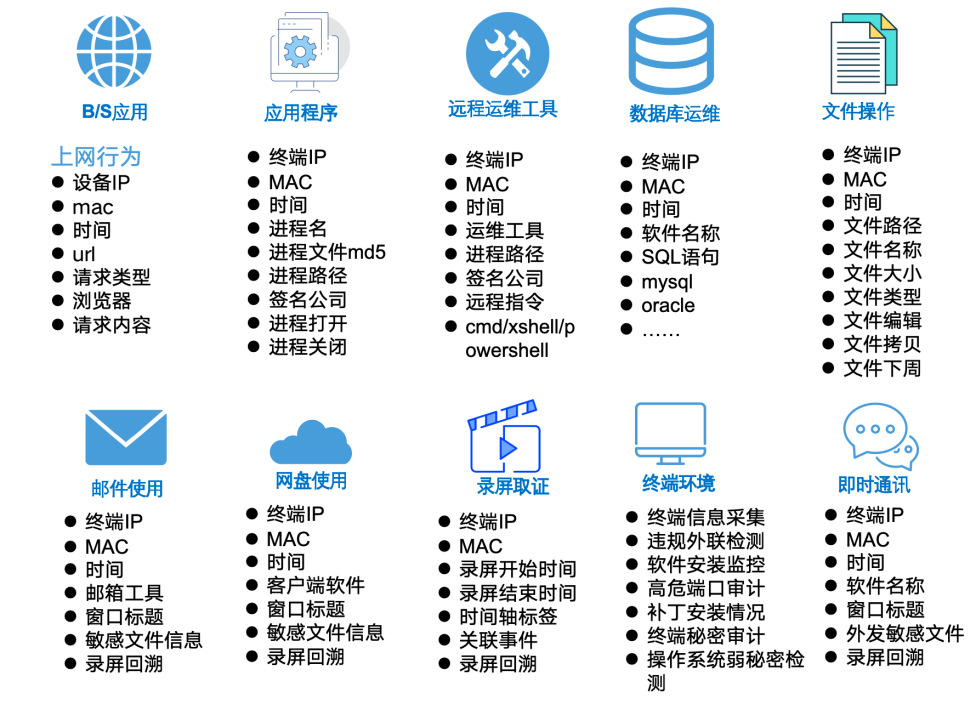 基于幾十種信息泄漏場景通過北信源終端代理程序?qū)K端行為進(jìn)行全面審計(jì),包括B/S應(yīng)用、應(yīng)用程序操作、文件操作、運(yùn)維工具操作、數(shù)據(jù)訪問工具操作、即時(shí)通訊等。
