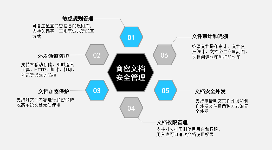 ◆通過文檔內容加密保護的技術,實現對包含商業秘密信息的電子文檔在起草階段的內容加密、透明使用,保證包含商業秘密信息的電子文檔在系統內部正常使用、脫離系統無法使用,避免內部人員主動泄露包含商業秘密信息的電子文檔;